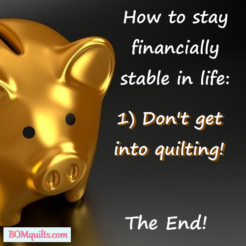 BOMquilts.com’s meme: It used to be said that quilting was less expensive than therapy. That is no longer the case! If you want to save your money now then don’t get involved in quilting!