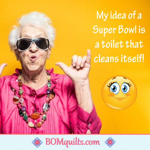 BOMquilts meme: Who cares if it is Super Bowl Sunday? I would rather enjoy my day quilting! Then searching for a new toilet for my quilt studio! One that cleans itself, so I don’t have to clean it, ever again!