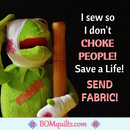 BOMquilts.com’s Meme: Poor Kermit! He forgot the first rule of mine & got in my crosshairs! If you don’t show up at my house with fabric, then you might end up like he did!