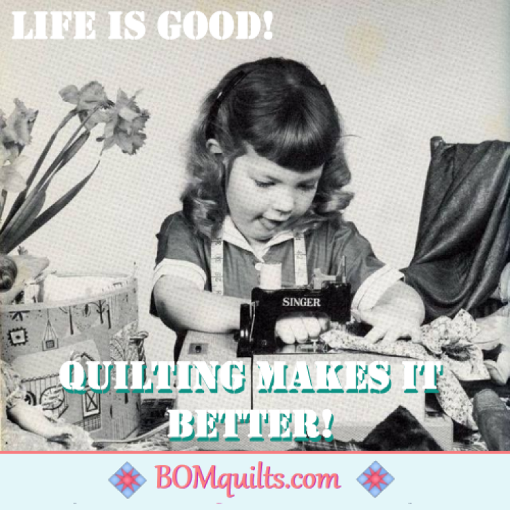 BOMquilts meme: Quilting makes everything better! Even a wee lass who is just starting to learn how to quilt, she knows what it takes to make life more fun!