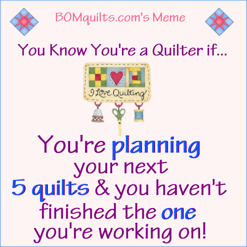BOMquilts.com’s meme: Isn’t it one of the definitions of being a quilter?! Planning the next five to twenty quilts ahead of time without finishing the one you’re working on?! At least that’s how I am! What about you?