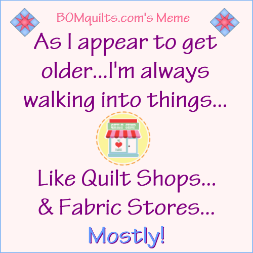 BOMquilts.com’s Meme: As I appear to get older I’m always walking into things…like quilt shops & fabric stores! Published January 2, 2021 at 500 × 500 in BOMquilts Memes BOMquilts.com’s Meme: As I appear to get older I’m always walking into things…like quilt shops & fabric stores!