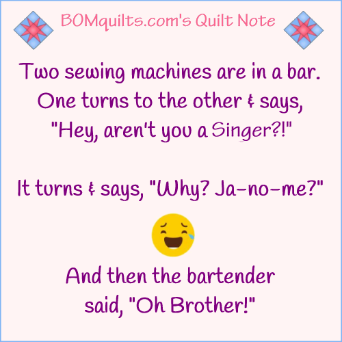 BOMquilts.com’s Meme: Two sewing machines are in a bar! You’ll never guess what happens next! Published January 2, 2021 at 500 × 500 in BOMquilts Memes BOMquilts.com’s Meme: Two sewing machines are in a bar! You’ll never guess what happens next!