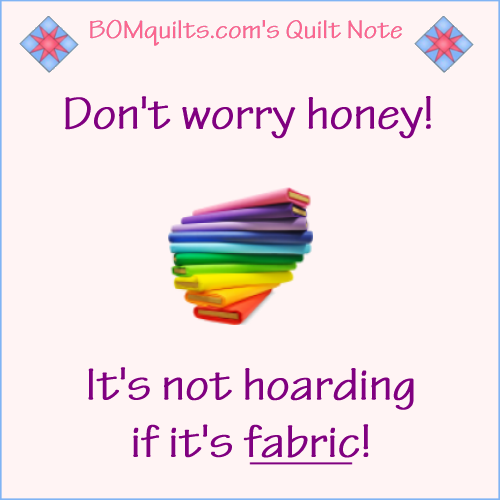 BOMquilts.com’s Meme: Don’t worry honey! I’m not a hoarder! Published January 2, 2021 at 500 × 500 in BOMquilts Memes BOMquilts.com’s Meme: Don’t worry honey! I’m not a hoarder!