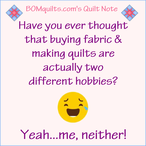BOMquilts.com’s Meme: Have you ever thought that buying fabric & making quilts are actually two different hobbies? Yeah…me, either! Published January 2, 2021 at 500 × 500 in BOMquilts Memes BOMquilts.com’s Meme: Have you ever thought that buying fabric & making quilts are actually two different hobbies? Yeah…me, either!