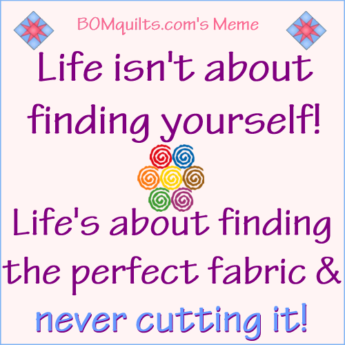BOMquilts.com’s Meme: Life isn’t about finding yourself! Life’s about finding the perfect fabric & never cutting it! Published January 2, 2021 at 500 × 500 in BOMquilts Memes BOMquilts.com’s Meme: Life isn’t about finding yourself! Life’s about finding the perfect fabric & never cutting it!