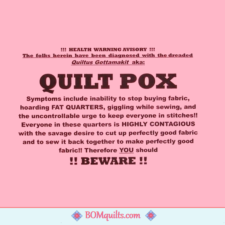 BOMquilts Meme: Health Warning Advisory: Beware of the Quilt Pox! Published February 27, 2026 at 740 × 740 in BOMquilts Memes BOMquilts Meme: Health Warning Advisory: Beware of the Quilt Pox!